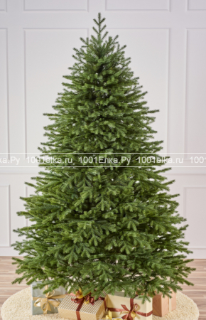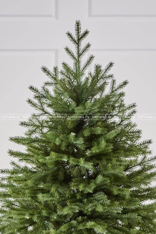 Дерево обладает безупречным объемом и пропорциями. Густая крона с плотно расположенными ветвями скрывает ствол, создавая эффект роскошного, только что принесенного из леса дерева. Никакого видимого пластика или неестественного блеска — только матовая, благородная хвоя глубокого зеленого оттенка.